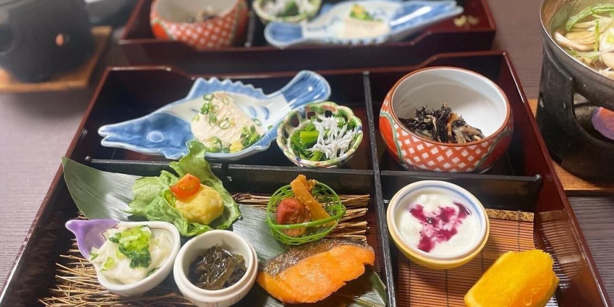 献立(一例) | 宮城サーモン焼き魚 / お豆腐 / 野菜のサラダ / 小鉢 / 味噌汁 / 清流育ちの「秋保米」 など |